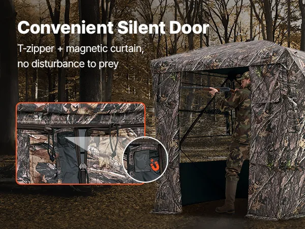 Silent Magnetic Door: The hunting blind uses magnetic curtain opening design with a T-zipper and extended magnetic strip to ensure quiet entry and exit. The windows and silent slide rails offers a 270° wide view for easy tracking