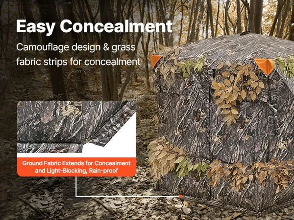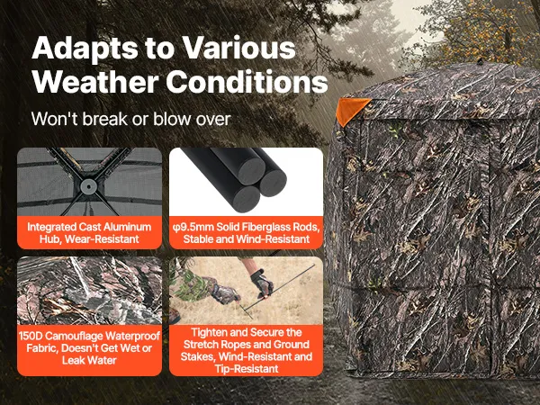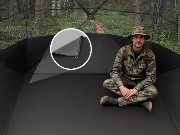 Resistant to Harsh Weather: Our upgraded all-aluminum hub use a sturdy structure. The hunting ground blind is made of 150D waterproof fabric, rain and wind-resistant. Solid fiberglass tubes are detachable. Reflective fabric can be attached