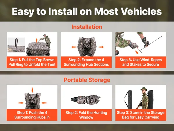 Easy to Carry and Assemble: With telescopic folding design, you can store the portable hunting blind in a dual-shoulder storage bag. Just pull the center point of each side, secure with wind ropes and stakes to complete installation
