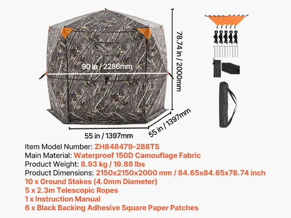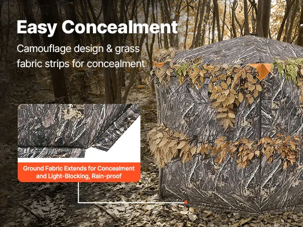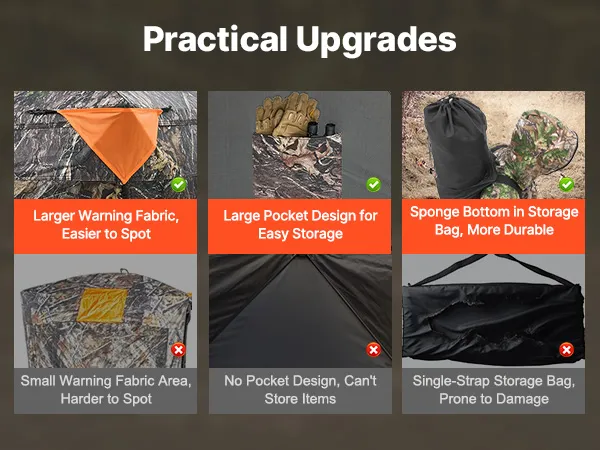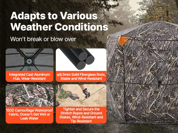 Resistant to Harsh Weather: Our upgraded all-aluminum hub use a sturdy structure. The hunting ground blind is made of 150D waterproof fabric, rain and wind-resistant. Solid fiberglass tubes are detachable. Reflective fabric can be attached