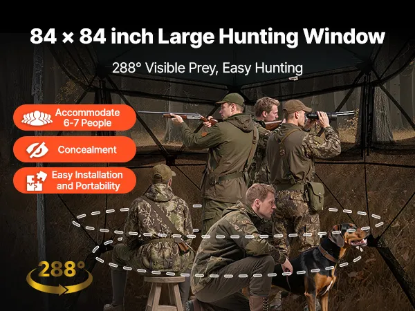 Spacious Design: Dimension: 84x84x79 in. With large interior, our turkey deer blind tent can accommodates 6-7 people. Concealed shelter with diamond-pattern warning fabric, is detachable to increase visibility and prevent accidental injury