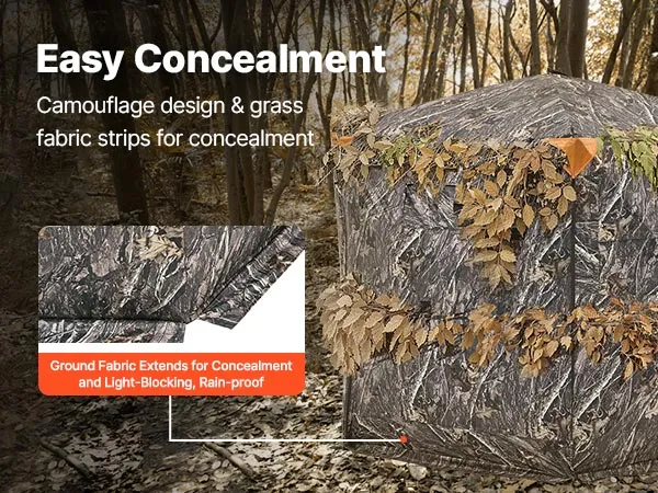 Unique Concealment Design: The blind for deer hunting uses camouflage disguise, silent metal bar zipper top-opening door, silent plastic track windows for easy opening and closing. The top and middle rings can be fitted with grass fabric strips. The bottom adds a 10cm wide ground fabric for concealment and light-blocking
