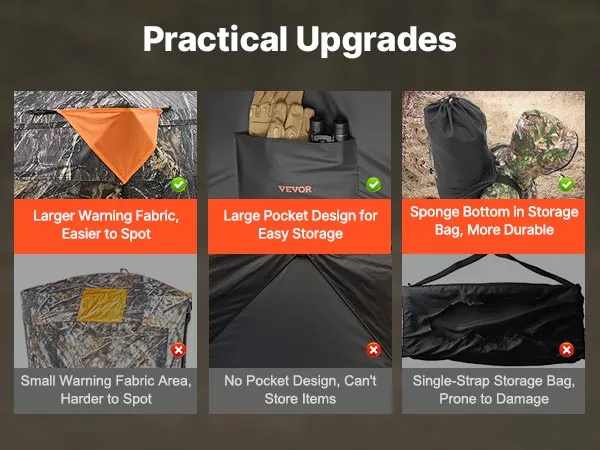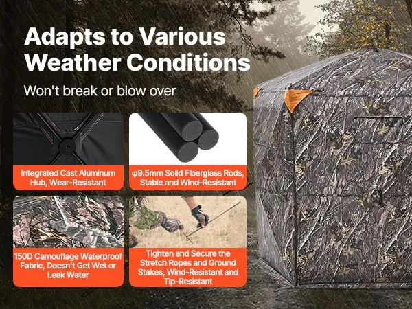Resistant to Harsh Weather: Our upgraded all-aluminum hub use a sturdy structure. The hunting ground blind is made of 150D waterproof fabric, rain and wind-resistant. Solid fiberglass tubes are detachable. Reflective fabric can be attached