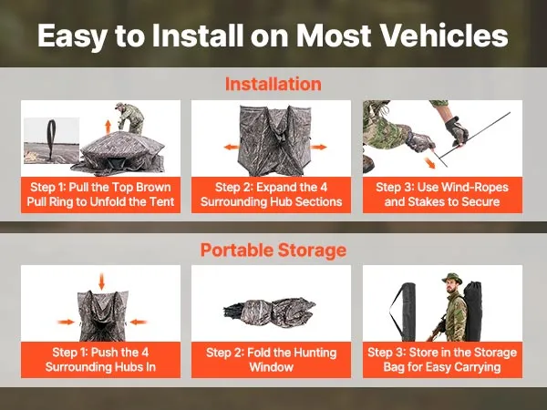Easy to Carry and Assemble: With telescopic folding design, you can store the portable hunting blind in a dual-shoulder storage bag. Just pull the center point of each side, secure with wind ropes and stakes to complete installation