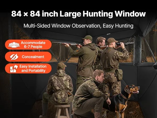 Spacious Design: Dimension: 84x84x79 in. With large interior, our turkey deer blind tent can accommodates 6-7 people. Concealed shelter with diamond-pattern warning fabric, is detachable to increase visibility and prevent accidental injury