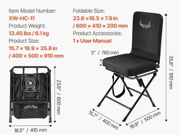 Foldable and Easy to Carry: Our hunting chair folds down to a compact 23.6 x 16.5 x 7.9 in/600 x 410 x 200 mm. Equipped with adjustable shoulder straps, it’s easy to carry and ideal for transport across outdoor environments