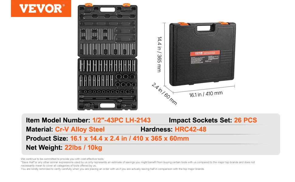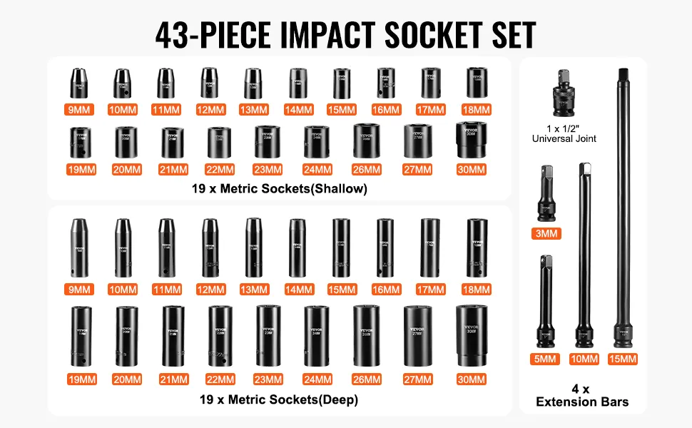 The VEVOR impact socket set includes 43 pieces. This set has a wide range of socket sizes. You can handle different tasks easily. It includes both standard and deep sockets. That makes it versatile for any job. No matter if you have small bolts or larger bolts, you have the right tool. The set covers metric sizes from 9 mm to 30 mm. This comprehensive collection meets diverse needs. There is no more searching for the missing size because each piece fits securely in the case. You can keep everything in one place, easy and organized. It is perfect for both professional and DIY projects. Enjoy efficient work without delays.