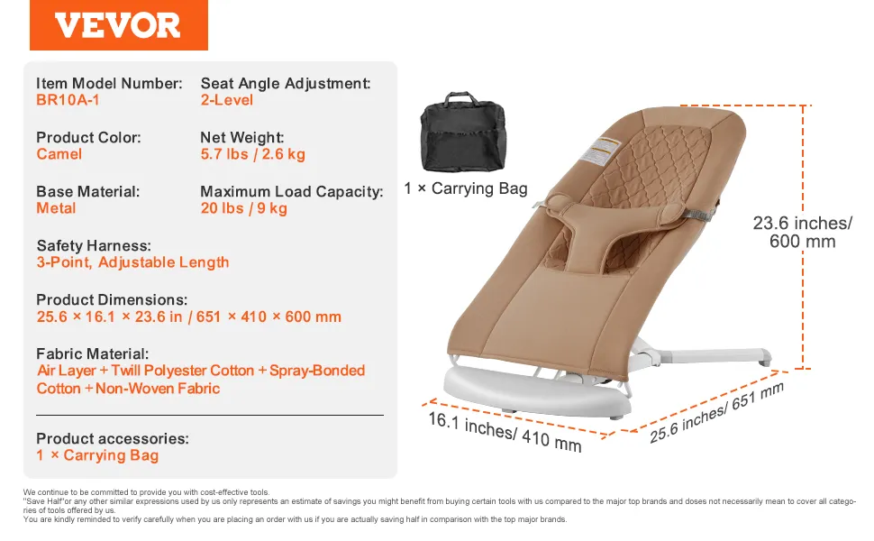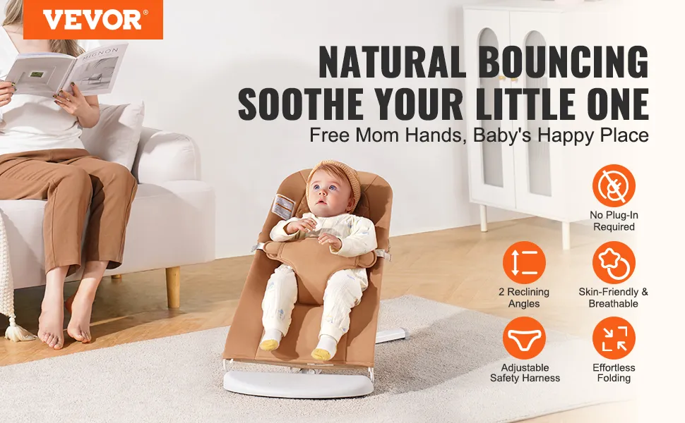 VEVOR Baby Bouncer, Folding Bouncer Seat for Babies 0-9 Months, Newborn Bouncer Chair with 2 Reclining Angles & 3-Point Harness, Portable Infant Rocker with Carrying Bag for Indoors Outdoors, Camel VEVOR Baby Bouncer, Folding Bouncer Seat for Babies 0-9 Months, Newborn Bouncer Chair with 2 Reclining Angles & 3-Point Harness, Portable Infant Rocker with Carrying Bag for Indoors Outdoors, Camel