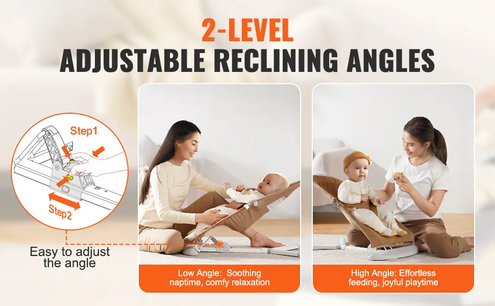 The infant bouncer seat features 2 reclining angles, accommodating your baby's varying needs whether they are playing or resting. You can easily adjust the chair's tilt, allowing your little one to play comfortably or sleep soundly in a cozy environment.