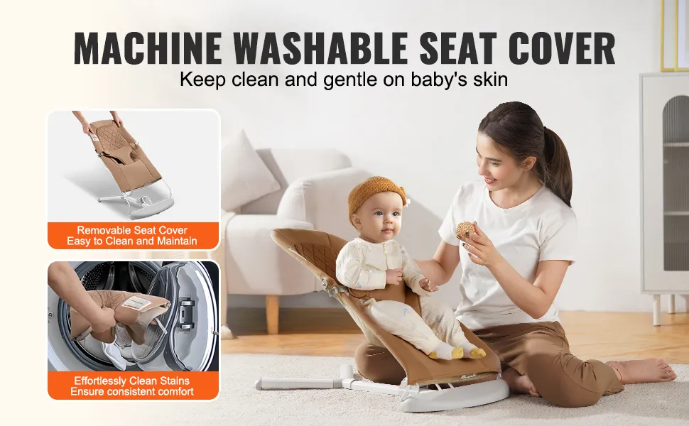 • Premium Materials: Our portable bouncer seat for babies is made from high-quality, soft cotton and non-woven fabric, skin-friendly and breathable. The removable, machine-washable cover simplifies cleaning and maintenance, so you can spend more time enjoying precious moments with your little one.