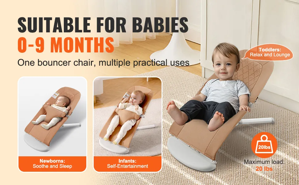 • Gentle Bouncing, Happy Babies: Natural bouncing, no plug-in required! VEVOR baby bouncer features 3-point safety harness and stereoscopic wrapping, providing a gentle and secure rocking experience. Soothing bouncing motions imitate moms warm womb, keeping your babies sleep soundly and play happily. (Suitable for 0-9 months babies, Maximum load: 20LBS)