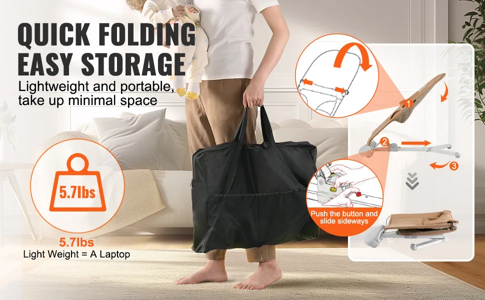 This portable bouncer seat for babies is lightweight and foldable, making it perfect for home use and on-the-go. Whether you’re at home, traveling, or visiting friends, it can be effortlessly stored in your car's trunk, ensuring your little one always has a cozy spot to relax.