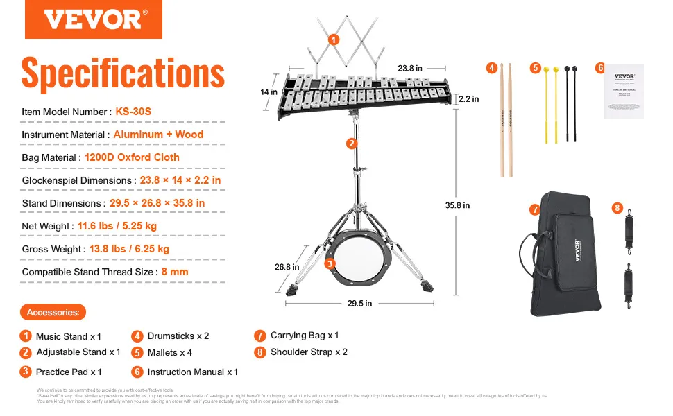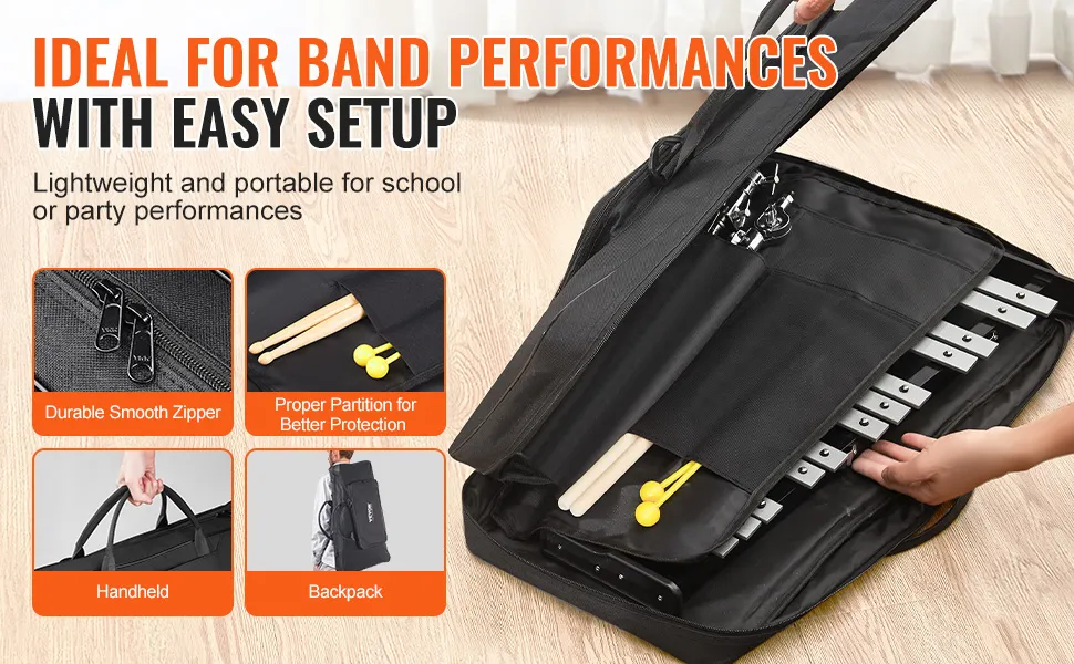 The VEVOR 30 note glockenspiel is made for easy assembly. You can set it up quickly without any trouble. The carrying case provided makes it easy to transport. It is constructed from durable 1200D Oxford cloth, ensuring the instrument is well-protected. This portability feature is especially useful for students carrying their instruments to and from school or music lessons. Whether you're an athlete or not, this portable device is ideal because it's super lightweight. So kids can easily carry on their own. We also have this glockenspiel, which is perfect for on-the-go practice sessions. The students can practice anytime, anywhere.