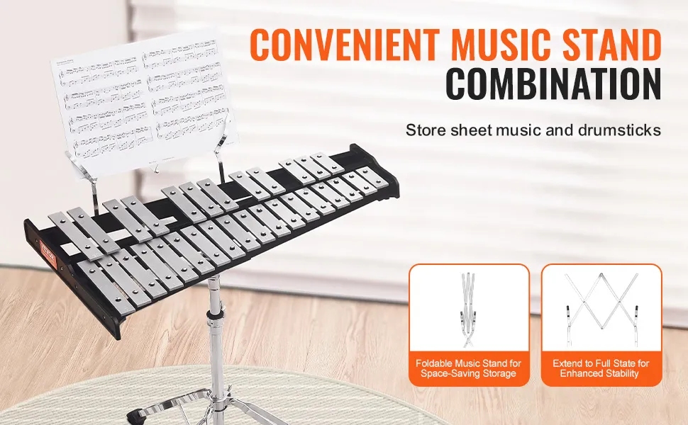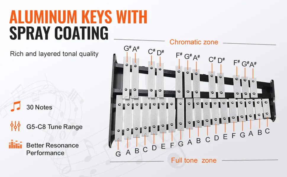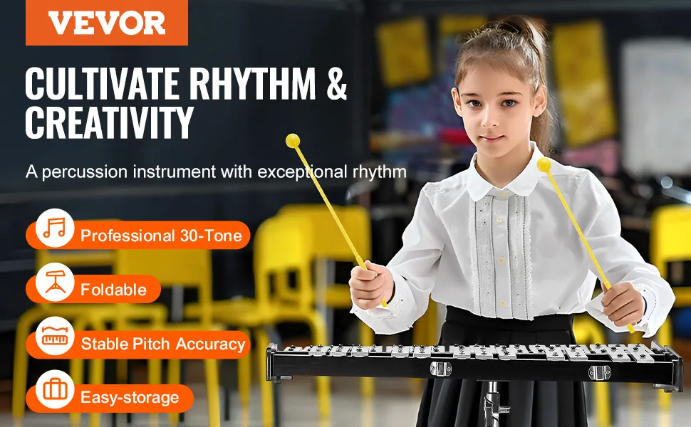 The VEVOR 30 note glockenspiel is the perfect instrument for beginners. Its design makes it easy for young musicians to learn and play. The bars are made from high-quality aluminum, offering a clear and resonant sound. These well-tuned notes make hearing and performing the correct notes easier for beginners. They are incredibly compact and lightweight, making them simple to handle, even for small hands. This instrument is ideal for students who are just starting their musical journey. You will get based on learning with this instrument. We're great for introducing kids to the world of operculum and music. In this glockenspiel, we want to keep them engaged and excited about learning.