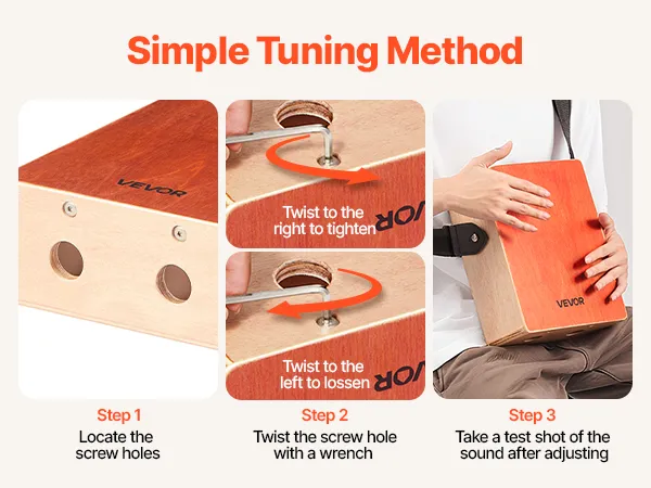 • Your Sound, Your Control: You can adjust the internal strings from the bottom of the portable box drum using the included hex wrench. Turn counterclockwise to loosen, clockwise to tighten, and change the tone