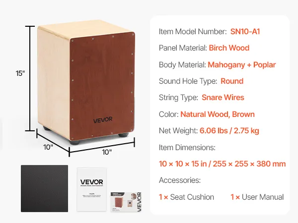 VEVOR Cajon Box Drum, with Internal Snare Wires, Compact and Lightweight Wooden Percussion Box, Birch Wood Drum Musical Instrument with Silicone Feet, for Beginners and Professionals, 10 x 10 x 15 in