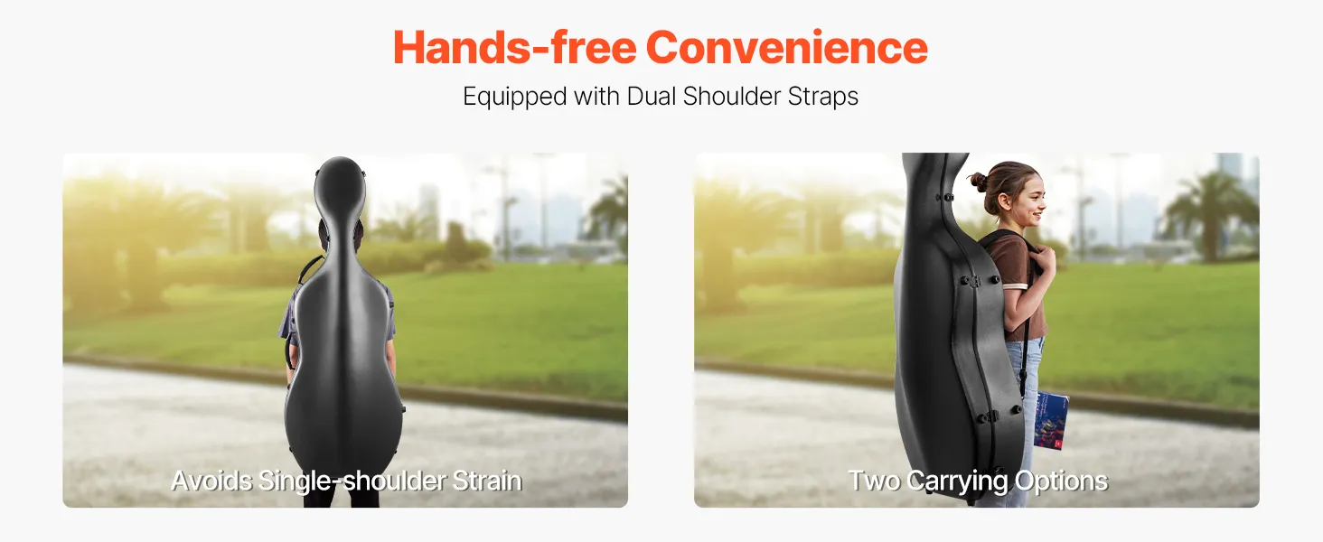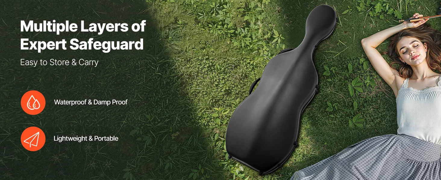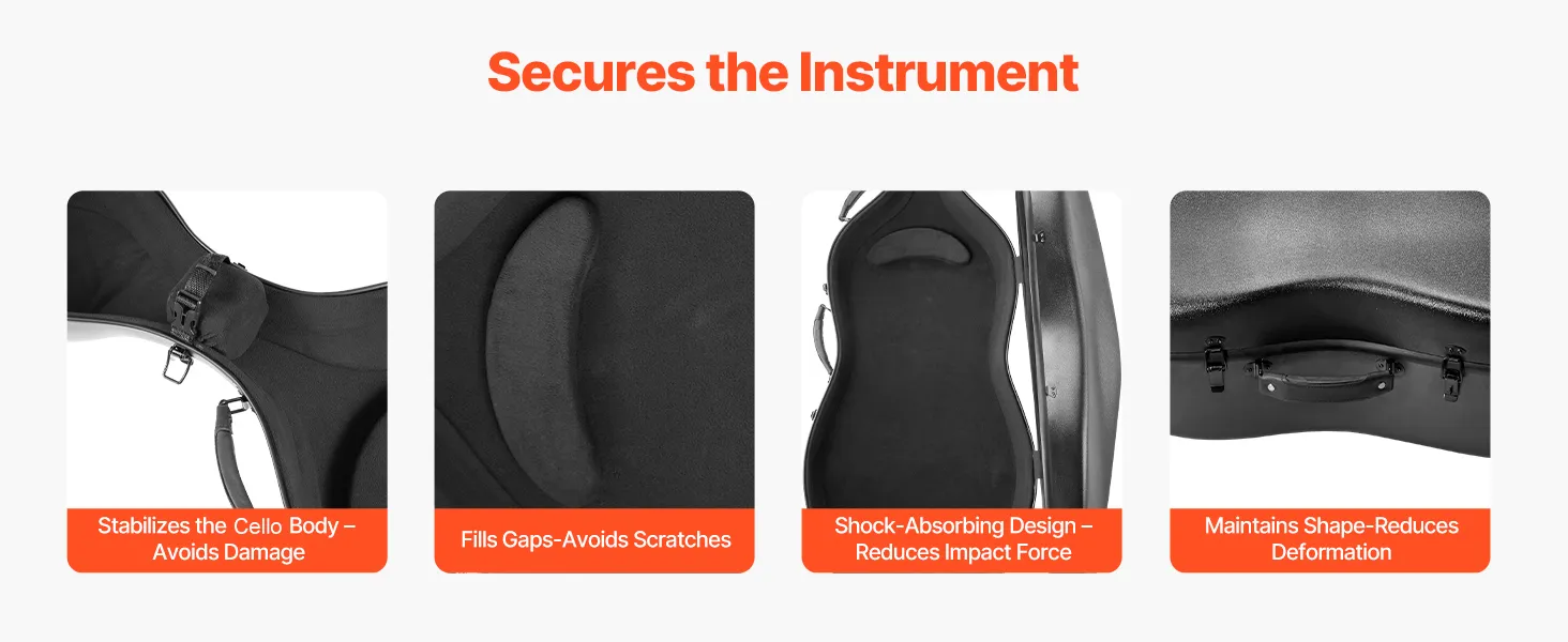 Comprehensive Shielding Design: The cello case features a premium composite carbon fiber shell with strong pressure resistance. Inside, soft EVA foam absorbs impact, while a plush lining helps reduce scratches during movement
