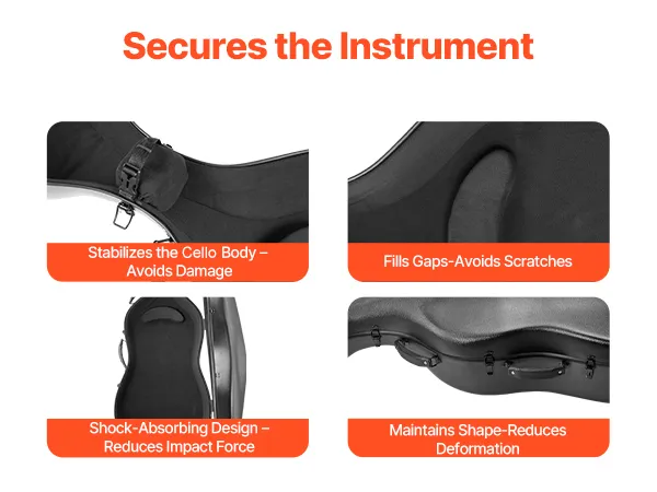 Stable Cello Placement: Inside the 4/4 cello case, a built-in neck holder keeps the cello centered and suspended during transport, helping to avoid collisions and damage