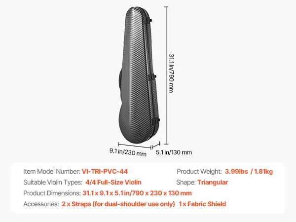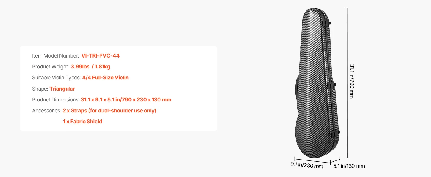VEVOR 4/4 Full Size Violin Case, Built-in Hygrometer, Lightweight Portable Travel Carrying Bag, with Plush Lining, Dual Shoulder Straps, Anti-Scratch, Professional Triangular Shape, for Violin, Black VEVOR 4/4 Full Size Violin Case, Built-in Hygrometer, Lightweight Portable Travel Carrying Bag, with Plush Lining, Dual Shoulder Straps, Anti-Scratch, Professional Triangular Shape, for Violin, Black