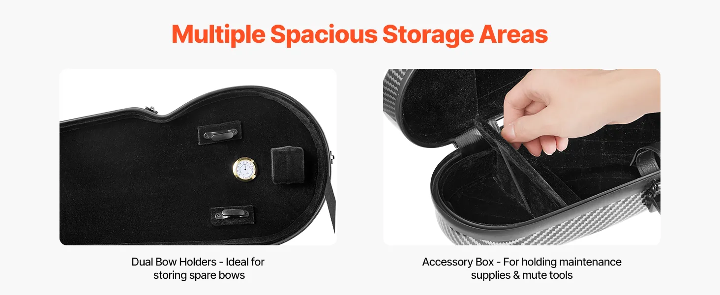 The violin case bag allows easy storage of a spare bow, while the spacious accessory box allows for tidy storage of mutes, tuning instruments, and other essentials.