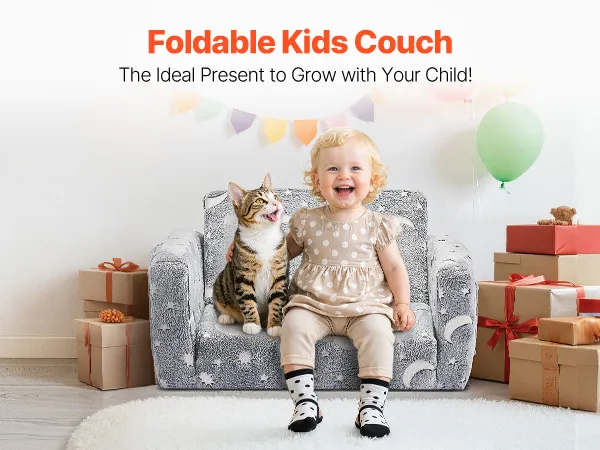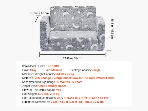 VEVOR 2-in-1 Kids Sofa, Foldable Toddler Soft Couch with Armrests, Glow in the Dark Kids Couch Fold Out with 28D Sponge & Flannel, Convertible Toddler Chair to Lounger for Reading and Gaming, M, Gray