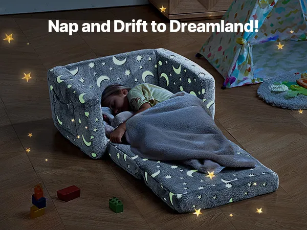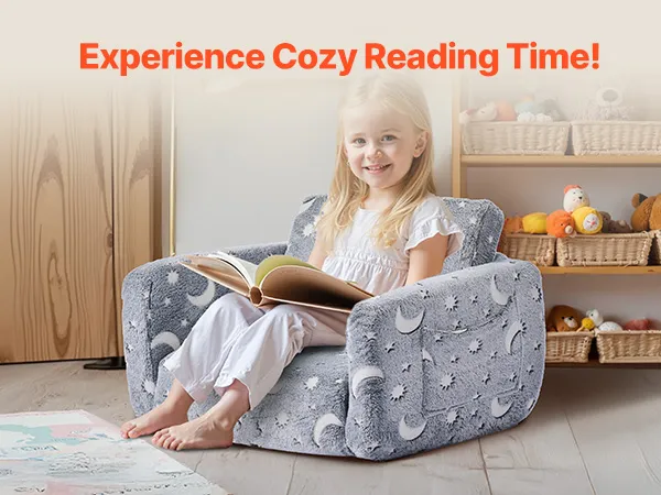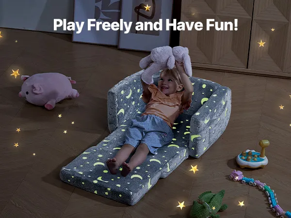 Curiosity & Wonder: Crafted with glow-in-the-dark flannel fabric, this kids couch absorbs light during the day and emits a gentle glow at night, revealing adorable patterns that shine in the dark. It’s a magical little world that sparks curiosity and imagination
