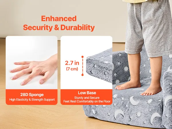 Reliable & Supportive Build: To enhance stability, we designed a wide, low-center base filled with lightweight yet resilient 28D high-density foam. This ensures strong support for active kids who love to jump, roll, and play