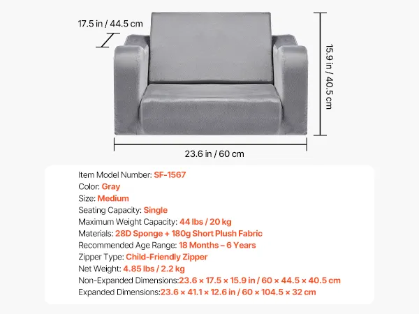 VEVOR 2-in-1 Kids Sofa, Foldable Toddler Soft Couch with Armrests, Made of 28D Sponge & Short Pile, Convertible Toddler Chair to Lounger, Kid Couch Fold Out for Fun Playtime or Comfy Lounging, M, Gray