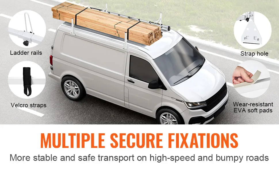 The van rack is made from Q235 material, heavy-duty and sturdy, with strong load-bearing capacity to ensure worry-free transportation of heavy goods. Multiple securing options make transporting ladders, lumber, and other items more efficient and safe.