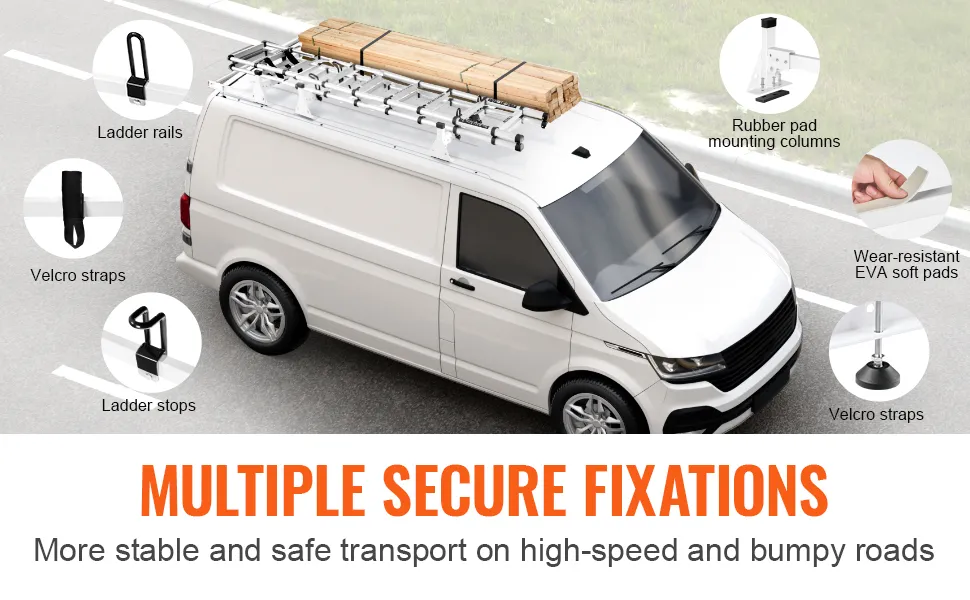 The van rack is made from Q235 material, heavy-duty and sturdy, with strong load-bearing capacity to ensure worry-free transportation of heavy goods. Multiple securing options make transporting ladders, lumber, and other items more efficient and safe.