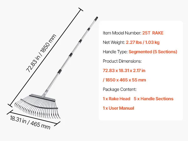 25 Durable Metal Tines: Built with high-quality stainless steel, the tines are tightly spaced at 0.28 inch apart to resist bending and rust. The garden rake is designed to handle heavy loads without deforming, even after extended outdoor use
