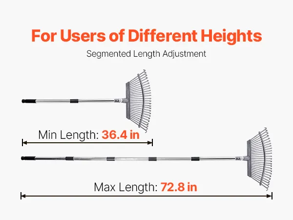Adjustable Length: Our metal leaf rake features a segmented handle. It adjusts from 36.4 to 72.8 inches, making it easy to find the comfortable length for users of any height or raking style