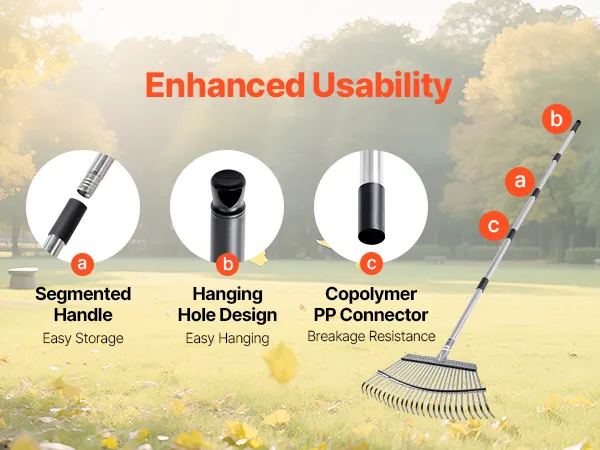 The segmented handle disassembles for compact storage. Our metal leaf rake features a hanging hole for storage, a non-slip grip for comfort, and a durable co-polymer PP connector to avoid cracking during outdoor tasks.