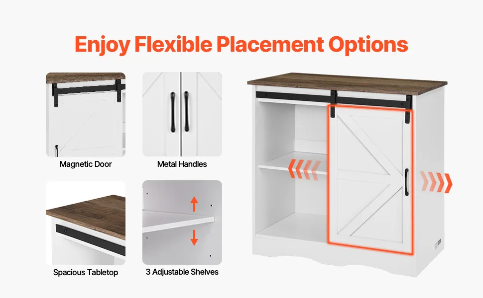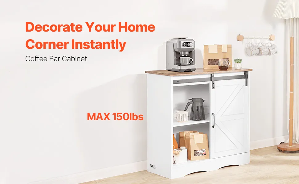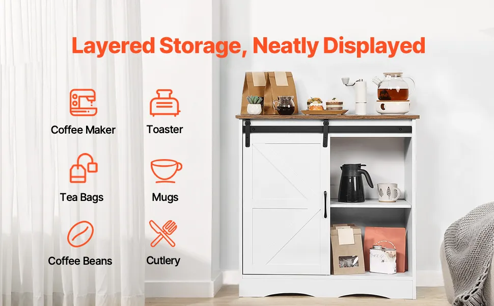This farmhouse coffee bar cabinet offers multi-tier storage for coffee tools, tableware, and small appliances. Made with high-quality materials, it features barn doors and metal handles for added elegance. Easy assembly with an anti-tip device for stability.