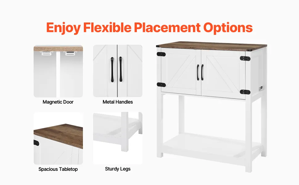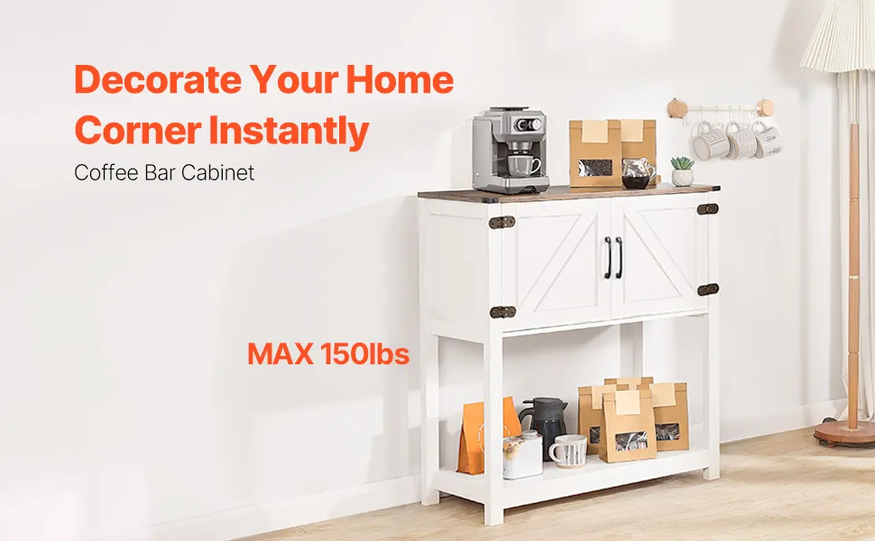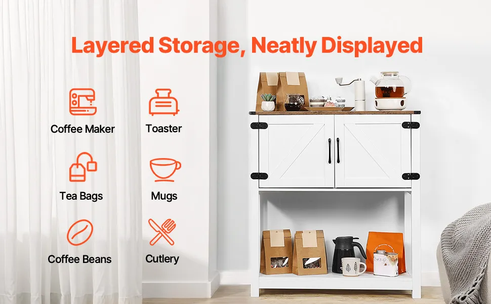 This farmhouse coffee bar cabinet offers multi-tier storage for coffee tools, tableware, and small appliances. Made with high-quality materials, it features magnetic doors and metal handles for added elegance. Easy assembly with an anti-tip device for stability.