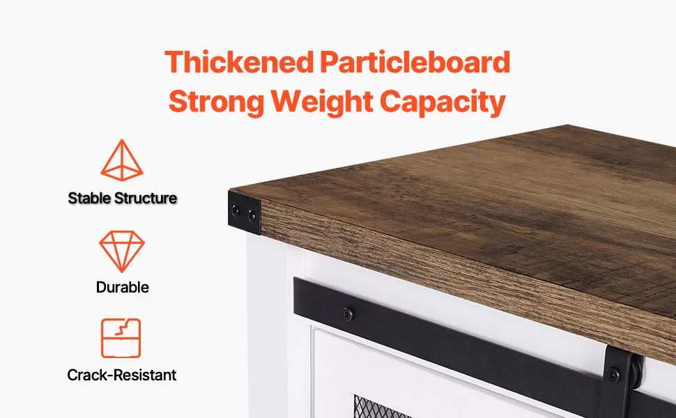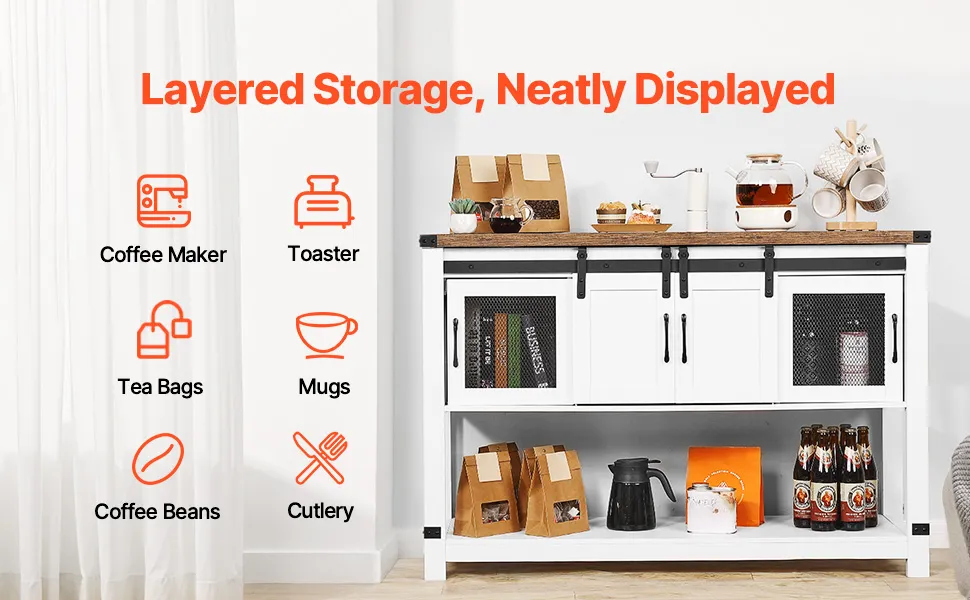 This farmhouse coffee bar cabinet offers multi-tier storage for coffee tools, tableware, and small appliances. Made with high-quality materials, it features barn doors and metal handles for added elegance. Easy assembly with an anti-tip device for stability.