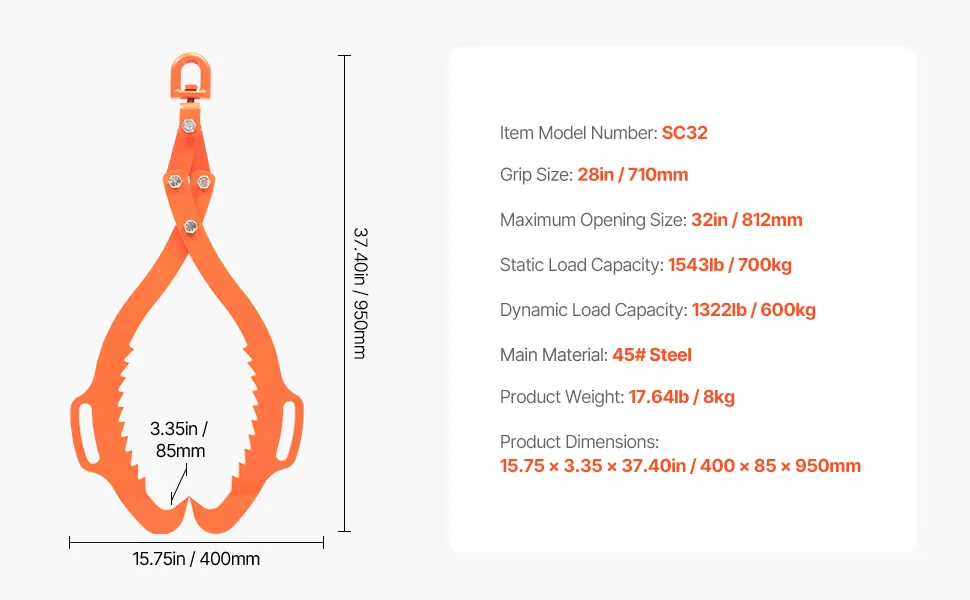 High Load Capacity: With a maximum load capacity of 1543 lbs, these log lifting tongs make heavy-duty tasks like transporting logs, wire mesh, and hay bales easier and safer. Equipped with a 360° rotating hook, they allow for quick adjustments and smooth handling. The ergonomic design minimizes fatigue, improving overall comfort and usability.