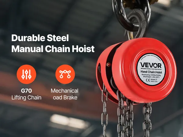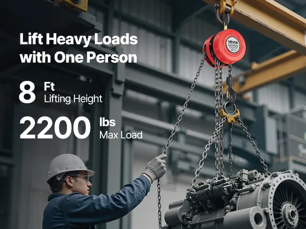 2200 lbs Heavy Duty Capacity: This hand chain hoist easily handles heavy lifting tasks, supporting up to 2200 lbs (1 T) and reaching heights up to 8 ft (2.44 m). Ideal for garages, construction sites, and warehouses