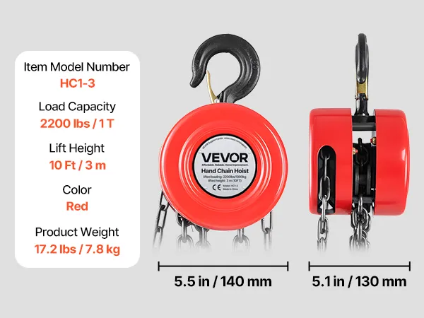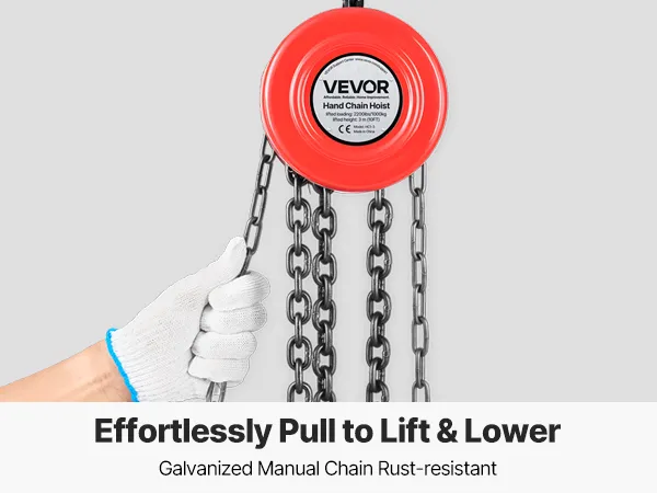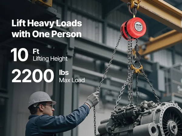 2200 lbs Heavy Duty Capacity: This hand chain hoist easily handles heavy lifting tasks, supporting up to 2200 lbs (1 T) and reaching heights up to 10 ft (3 m). Ideal for garages, construction sites, and warehouses