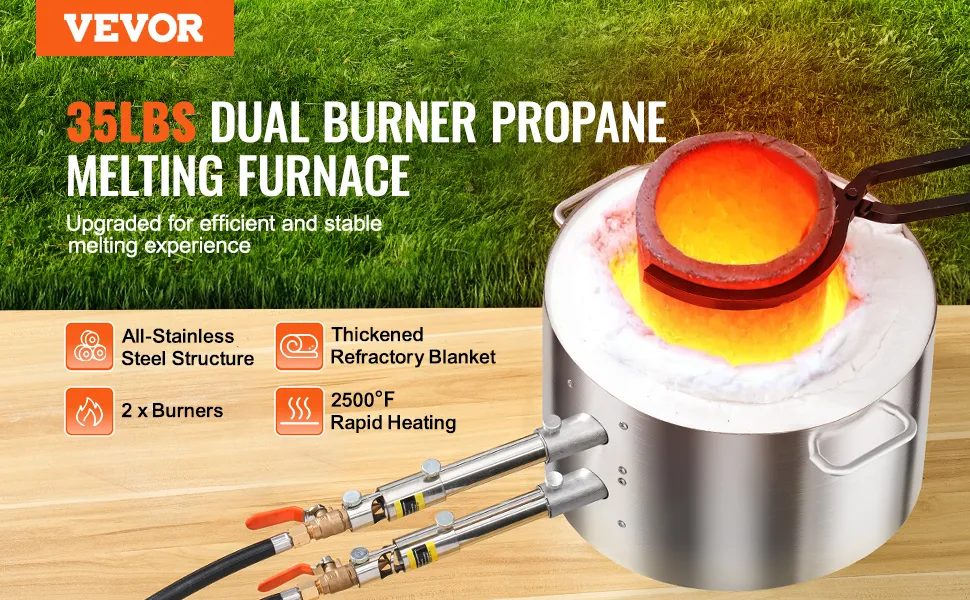 Featuring upgraded materials and design, with a full stainless steel body and dual burners, our propane melting furnace can rapidly heat up to 2500℉, providing an unprecedented, efficient, and stable melting experience.