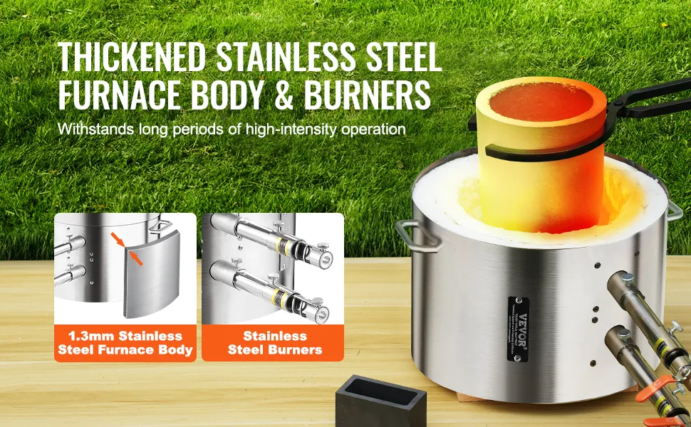 Durable Quality: Crafted with 1.3mm thickened stainless steel for both the furnace body and burners, this propane melting furnace is built to last, standing up to high temperatures and the test of time. Its sleek design is easy to clean and maintain, making it suitable for use in workshops, studios, or outdoors.