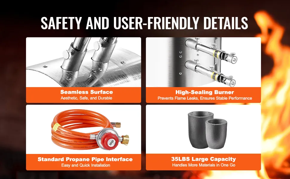 Secure and Reliable Details: The furnace body is free of visible welds, providing a clean and sleek appearance while ensuring safety. The burner sleeve uses a flange connection, and the propane hose features standard threaded connections, effectively preventing fire leakage. Enjoy a secure and effortless melting experience with our propane furnace for melting metal.