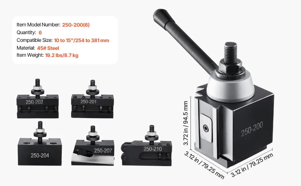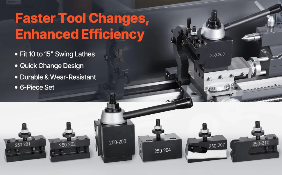 Our quick change tool post set fits 10 to 15 in lathes and works with various models. It enables fast tool changes with a handle turn, precise alignment with a rotating screw, and long-lasting durability with cast iron construction. Simple to install, it is ideal for upgrading your workshop.