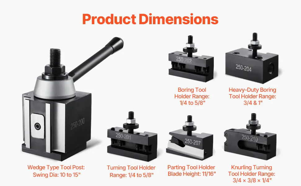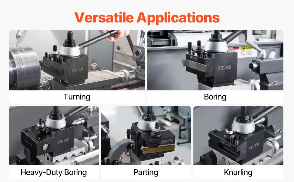 This lathe quick change tool post is designed to handle a variety of lathe tasks, including turning, boring, heavy-duty boring, parting, and knurling. It enhances performance across diverse machining applications.