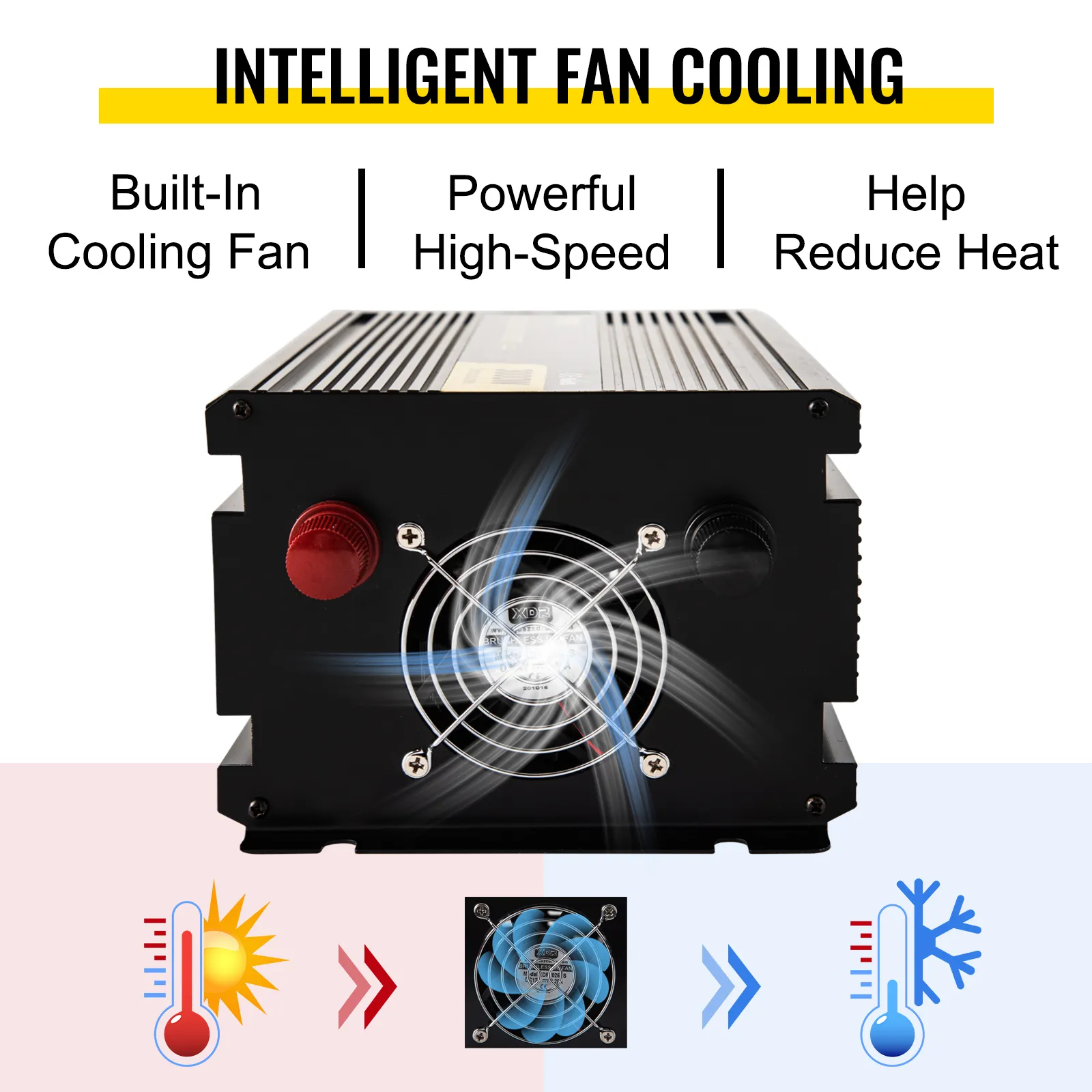 This modified sine wave inverter features an aluminum alloy shell, LCD screen, LED indicator, intelligent cooling fan, multiple protection measures, and LCD remote controller. Our power inverter transforms DC power into AC power, widely used for Emergency, Camping, Car, Home, RV, Solar. It is suitable for powering larger devices such as home appliances, power tools, like a blender, refrigerator, etc.