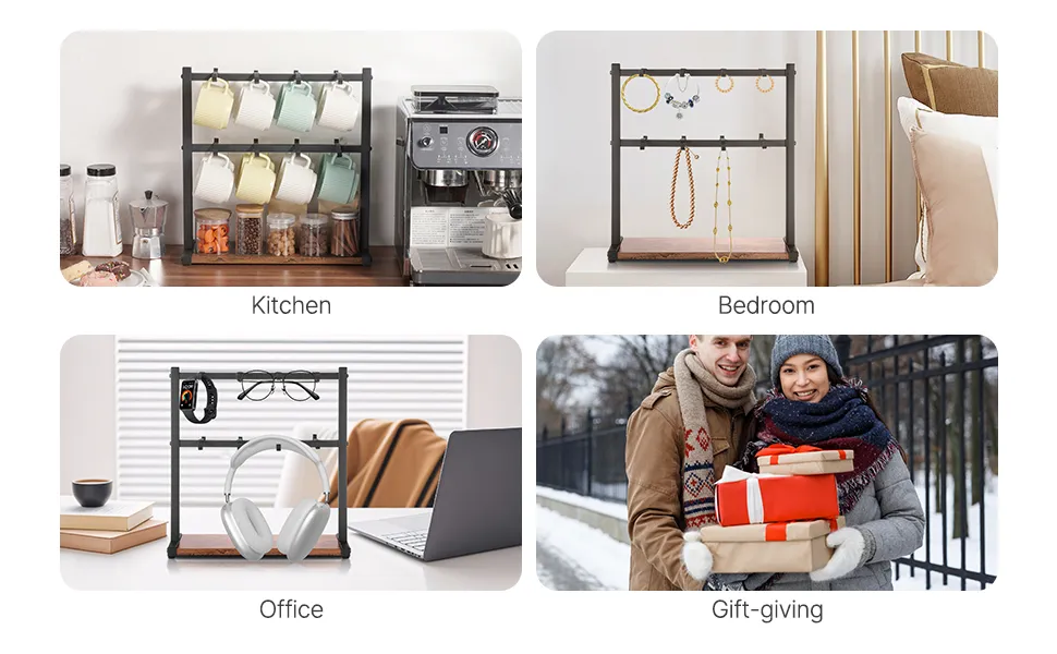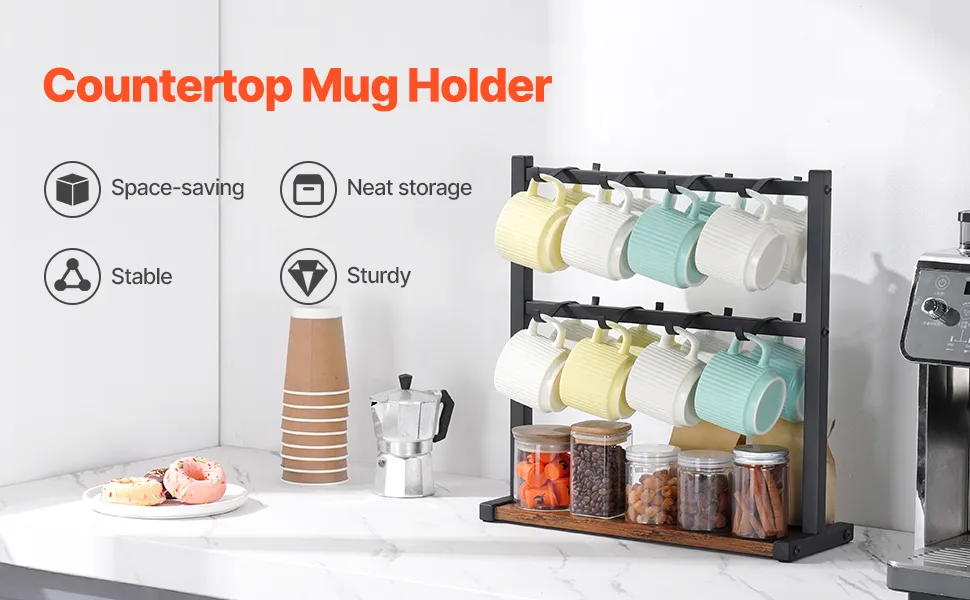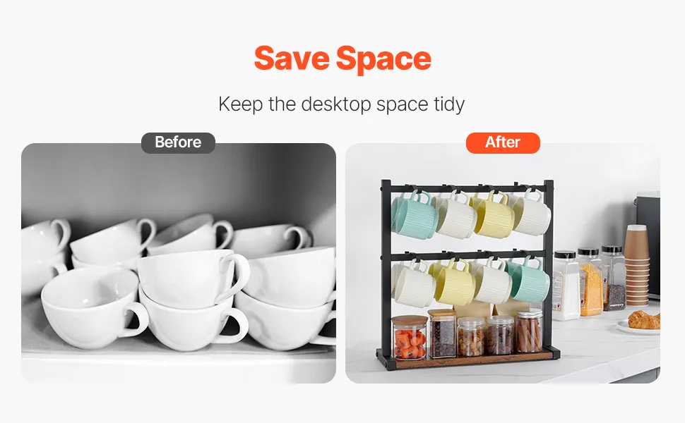 The coffee mug holder helps you make the most of your space, and freely place it in your office, kitchen, or home. It aids in organizing and storing coffee mugs, as well as accessories and more items, keeping your counter neat and orderly.
