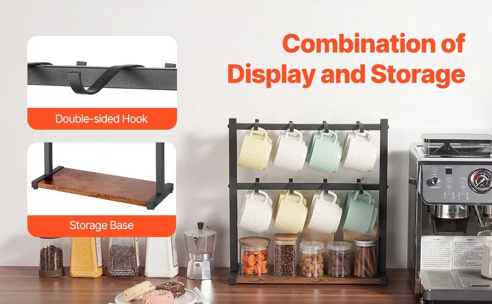 Multi-functional Organizer: The coffee mug holder features double-sided hooks, capable of holding 16 coffee mugs, while the wood storage base can accommodate various items such as coffee beans, tea, sugar, creamer, stirrers, snacks, and more