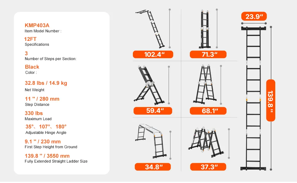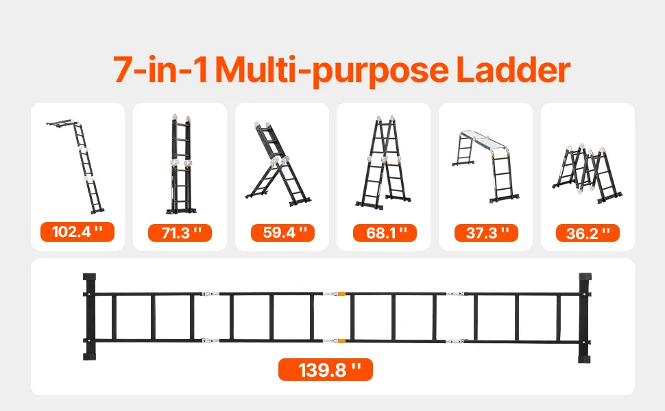 • 7-in-1 Versatility: This adjustable ladder can be folded into 7 shapes: A-frame, M-frame, ladder, L-shape, platform, folded, and straight. It is ideal for house cleaning, maintenance, home renovation, gardening, car washing, and more. It extends up to 139.8 inches, making it easy to reach rooftops. Additionally, it comes with two scaffolding platforms (34.1" x 23") for added safety and versatility during use.