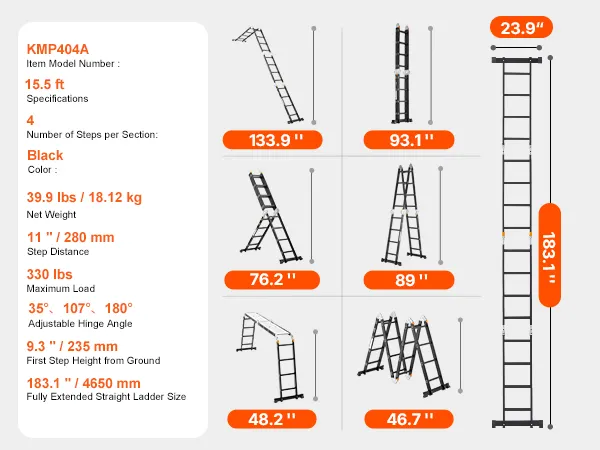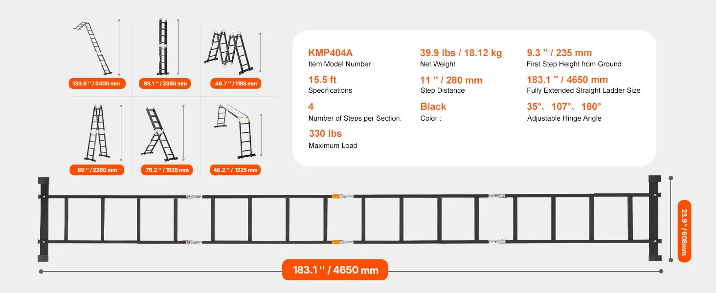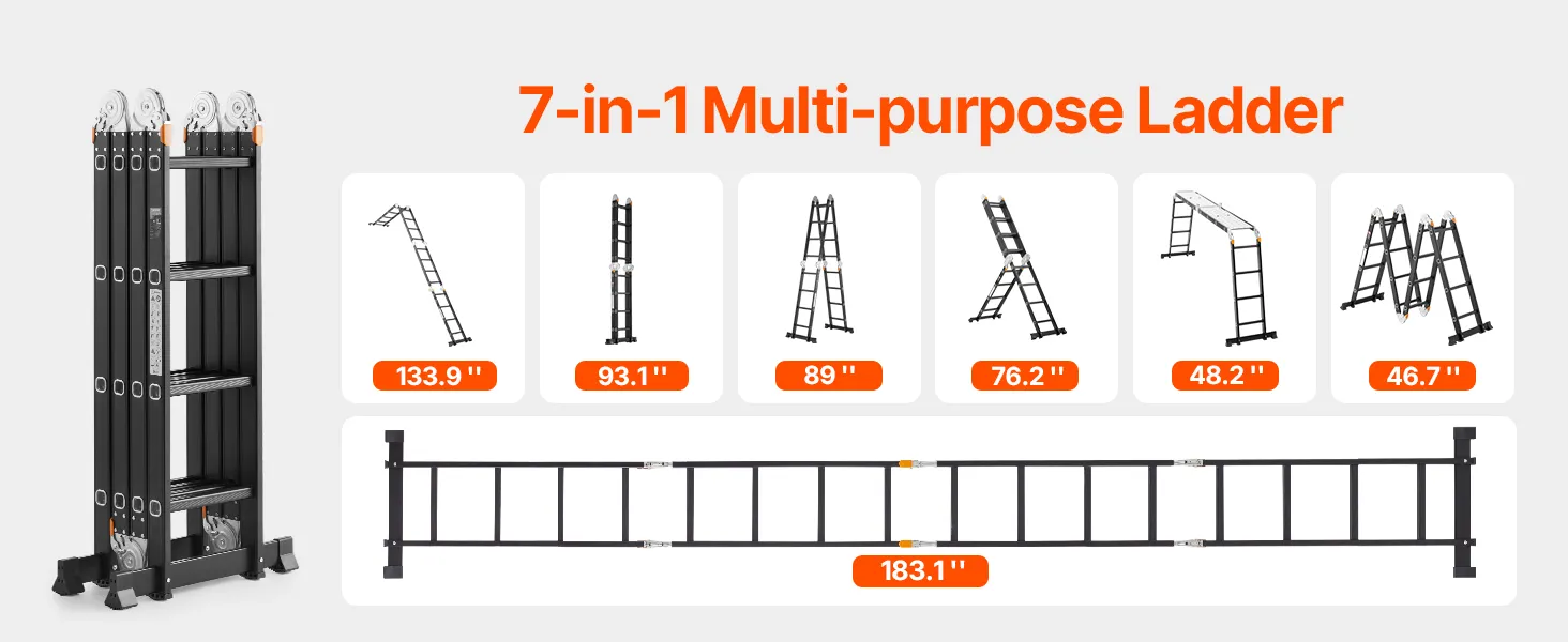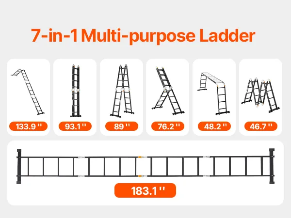 • 7-in-1 Versatility: This adjustable ladder can be folded into 7 shapes: A-frame, M-frame, ladder, L-shape, platform, folded, and straight. It is ideal for house cleaning, maintenance, home renovation, gardening, car washing, and more. It extends up to 183.1 '', making it easy to reach rooftops. Additionally, it comes with two scaffolding platforms (45.2 '' x 34.1 '') for added safety and versatility during use.