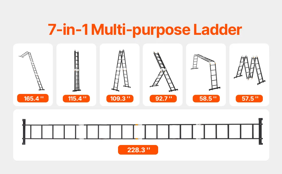 • 7-in-1 Versatility: This adjustable ladder can be easily folded into 7 different shapes: A-frame, M-frame, ladder, L-shape, platform, folded, and straight. It is perfect for various tasks such as house cleaning, maintenance, interior decoration, gardening, car washing, and more. It extends up to 228.3 '', making it easy to reach rooftops or high places.